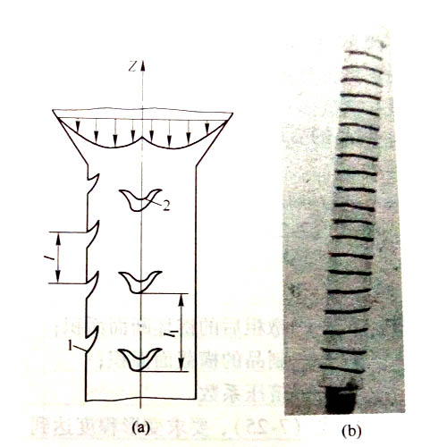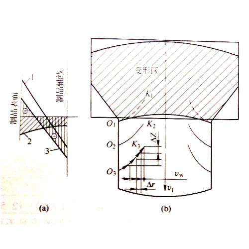 工業(yè)鋁型材擠壓速度增快,溫度升高,鋁型材抗拉強(qiáng)度降低;表面金屬疊加后產(chǎn)生的工作拉力和應(yīng)力時,就會出現(xiàn)裂紋,裂紋的狀態(tài)取決于裂紋向深部擴(kuò)展的速度和鋁型材的流出速度的相互關(guān)系;第一條裂紋出現(xiàn)以后,疊加后形成的工作拉應(yīng)力得到釋放,應(yīng)力減小,從而使裂紋向深部擴(kuò)展的速度減慢。若υw為等減速擴(kuò)展,則每一瞬間裂紋加深值為Δr,而鋁型材以固定速度υ1移動ΔZ值,其結(jié)果得到裂紋如圖1所示。當(dāng)此裂紋擴(kuò)展到一定深度后,該局部的附加應(yīng)力消失,裂紋停止發(fā)展;隨后金屬又呈周期性的出現(xiàn)裂紋,如圖2所示,直到調(diào)整擠壓速度為止。
